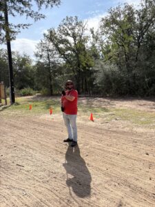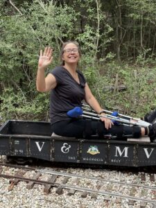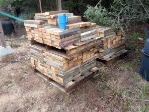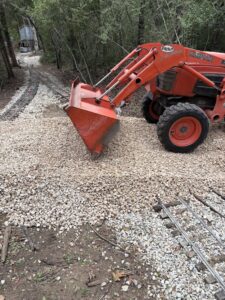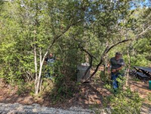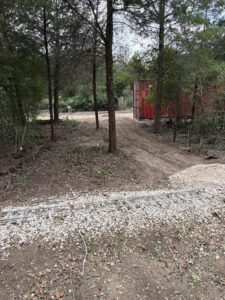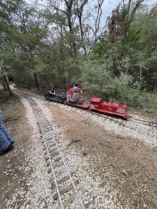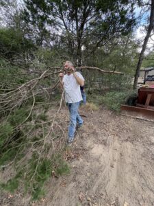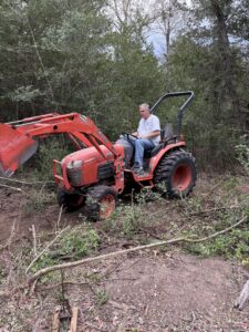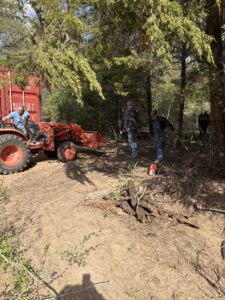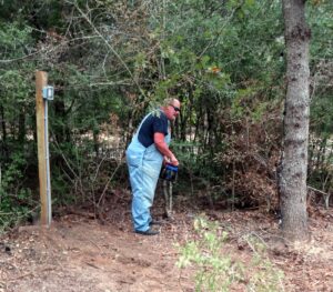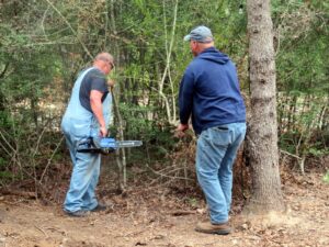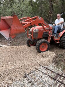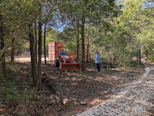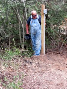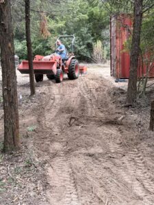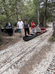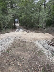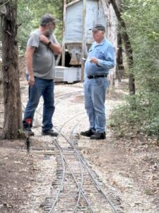 The first workday after the recent meet was attended by an enthusiastic group – Ken, Linda, John O, John T, Sophia, Paul, Janet, Doug, Kathy, David, Rick, Tim, Mike, Bob, Nick, Abby, Stephen, Lori, and little James and Ellie. We began the morning with a post-mortem on the recent meet and then jumped right into work. The focus was on clearing for the restroom building, a path to the social area, a shed for the kitchen, and the engine house.