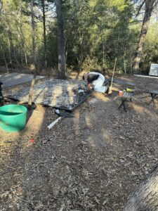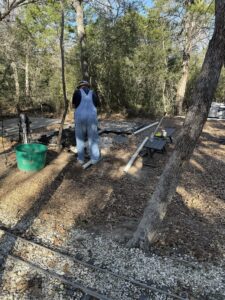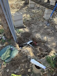 It was a full and productive workday out on the Austin & Texas Central Railroad, with plenty of hands making light work and good progress all around. Stephen kicked things off by repairing a water line break under steaming bay 9, getting everything back in working order. John O stayed busy installing new drain pipe for the kitchen shed after the old line proved too brittle, and he also set the post bases for the porch beam, locking in another important upgrade.