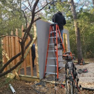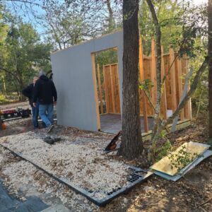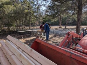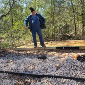 Ken, Linda, and James joined Stephen for an impromptu workday to raise the walls for the kitchen shed. Linda cooked up everyone’s favorite sausage and peppers which James provided along with potato salad and banana pudding. Mmmmm.