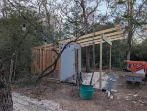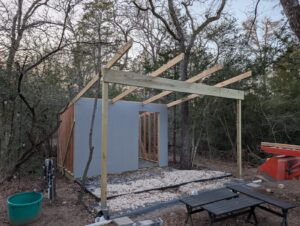 With the cold weather past, Stephen was able to install the porch beam and rafters. He reports that the beam was much heavier than expected, but the afternoon of work was successful without incident.